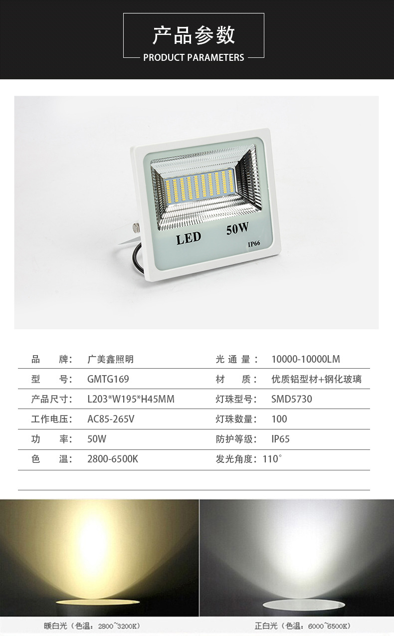 Whether cross-border supply  | no  | Color temperature  | 3000K (warm white), 4000K (white), 6500K (cold white)  | Series  | LED flood light  |