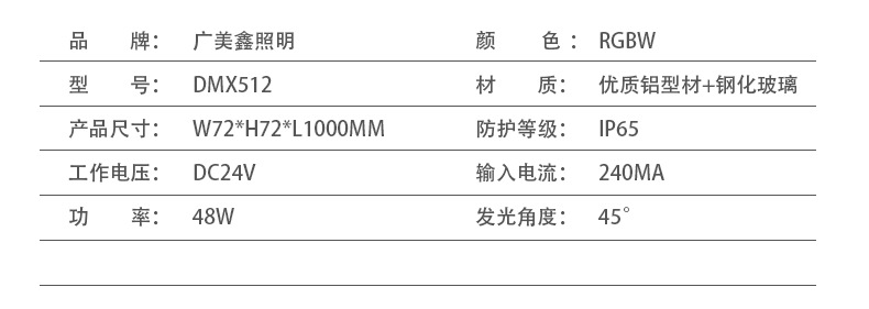 | 型號 | DMX512 | 輸入電壓 | 220(V) | 光通量 | 1800-2880(LM) |